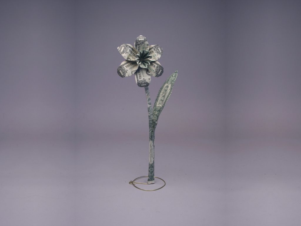 Four uncut one-dollar bills (flower) and four uncut one-dollar bills (stem and leaves)
